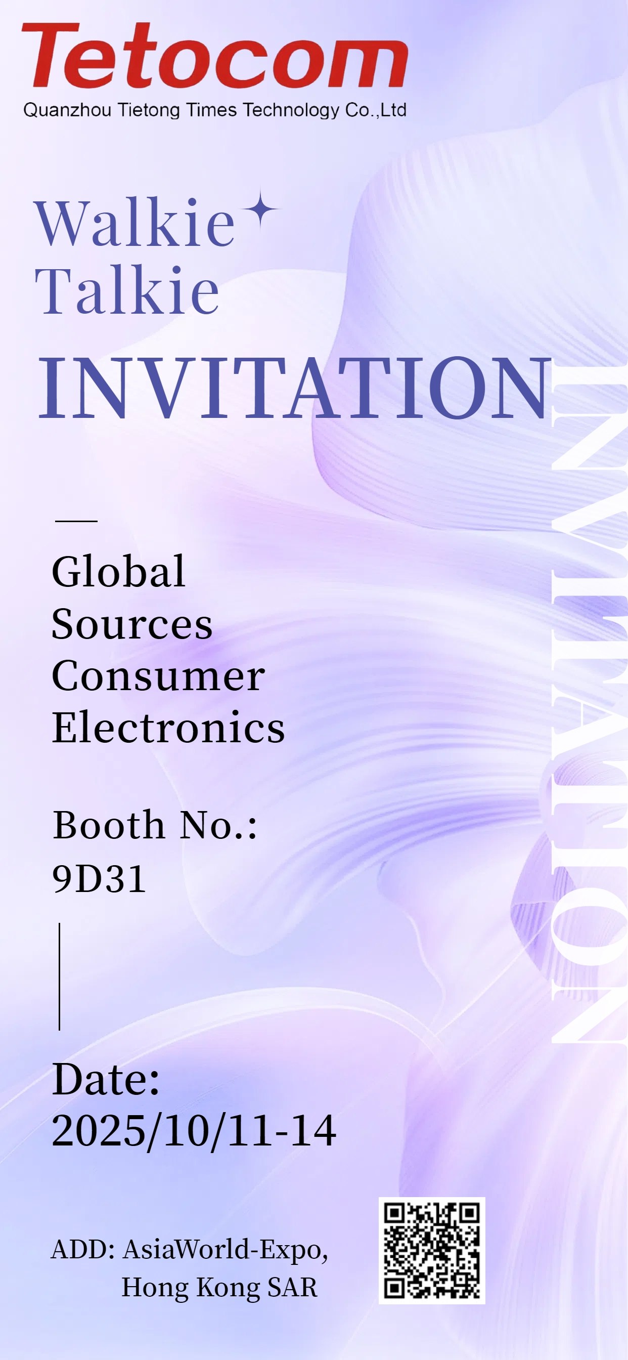 Quanzhou Tietong Times Technology Co., Ltd. is set to debut at the 2025 Global Source Consumer Electronics Show (Oct 11-14) at AsiaWorld-Expo, Hong Kong. Visit us at Booth 9D31 to explore our full-range two-way radio solutions tailored for global industries.